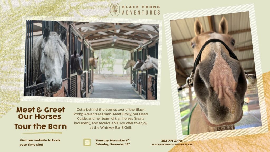 Get a behind-the-scenes tour of the Black Prong Adventures barn! Meet Emily, our Head Guide, and her team of trail horses (treats included!), and receive a $10 voucher to enjoy at the Whiskey Bar & Grill.